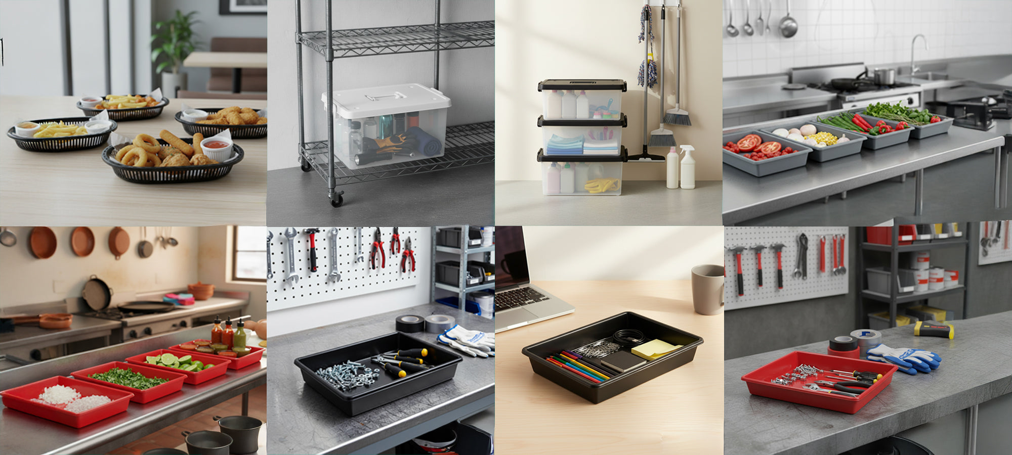 Charolas, cubetas y organizadores diseñados para uso industrial y comercial. Resistencia y funcionalidad que trabajan contigo día a día.